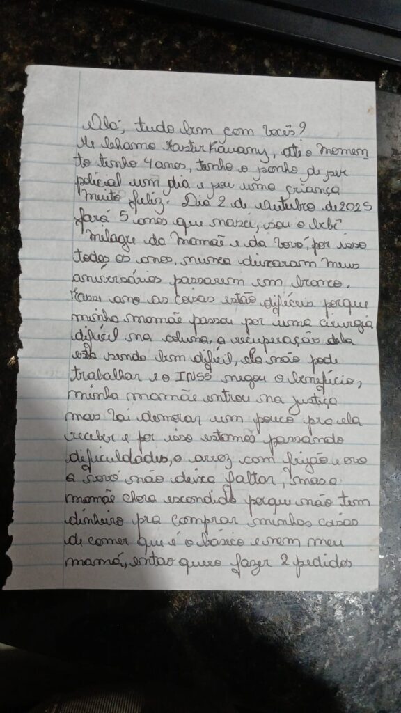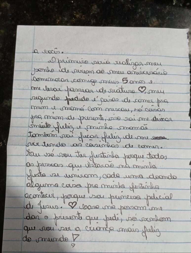 No bilhete, Ester contou que sua mãe passou por uma cirurgia na coluna e ainda se recupera, impossibilitada de trabalhar. Ela também relatou que, apesar da ajuda da avó, a família enfrenta dificuldades financeiras que até impedem a compra de leite e achocolatado, itens simples que fazem parte da infância de qualquer criança.