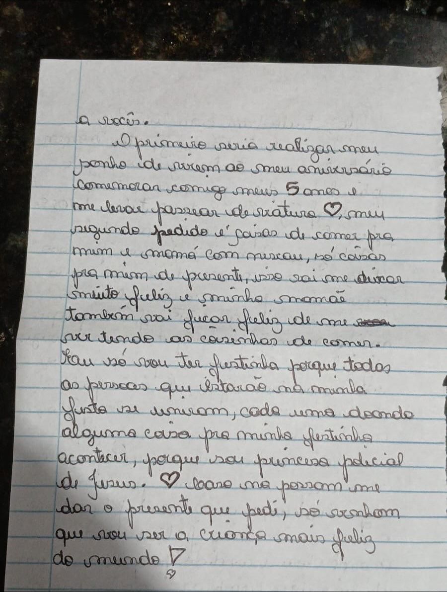 Na simplicidade de uma cartinha escrita com o coração, a pequena Ester, que completou 5 anos nesta semana, emocionou a Brigada Militar de Panambi. Com o sonho puro e decidido de um dia se tornar policial, Ester compartilhou não apenas seu desejo, mas também um pouco da realidade difícil que sua família enfrenta.